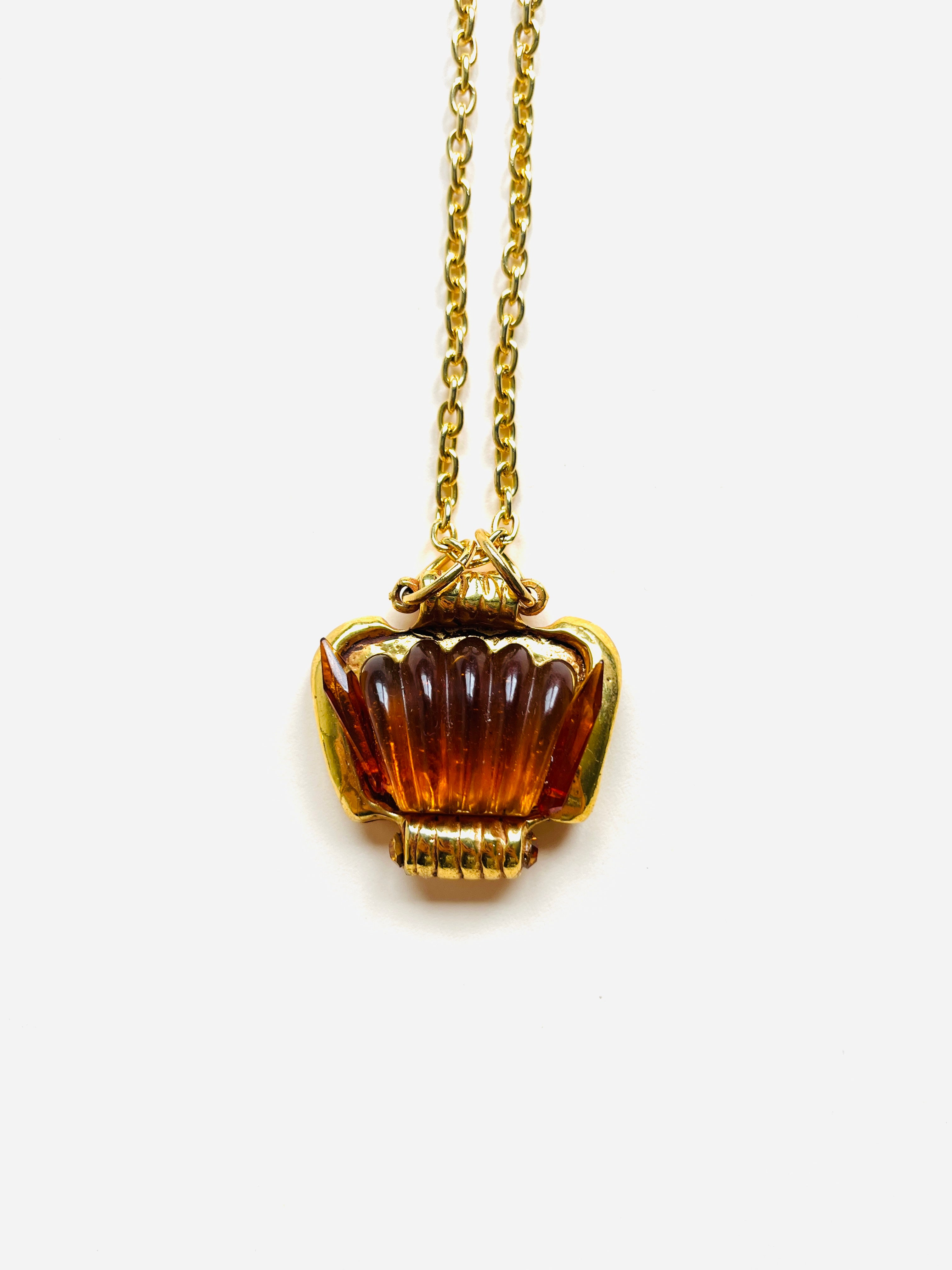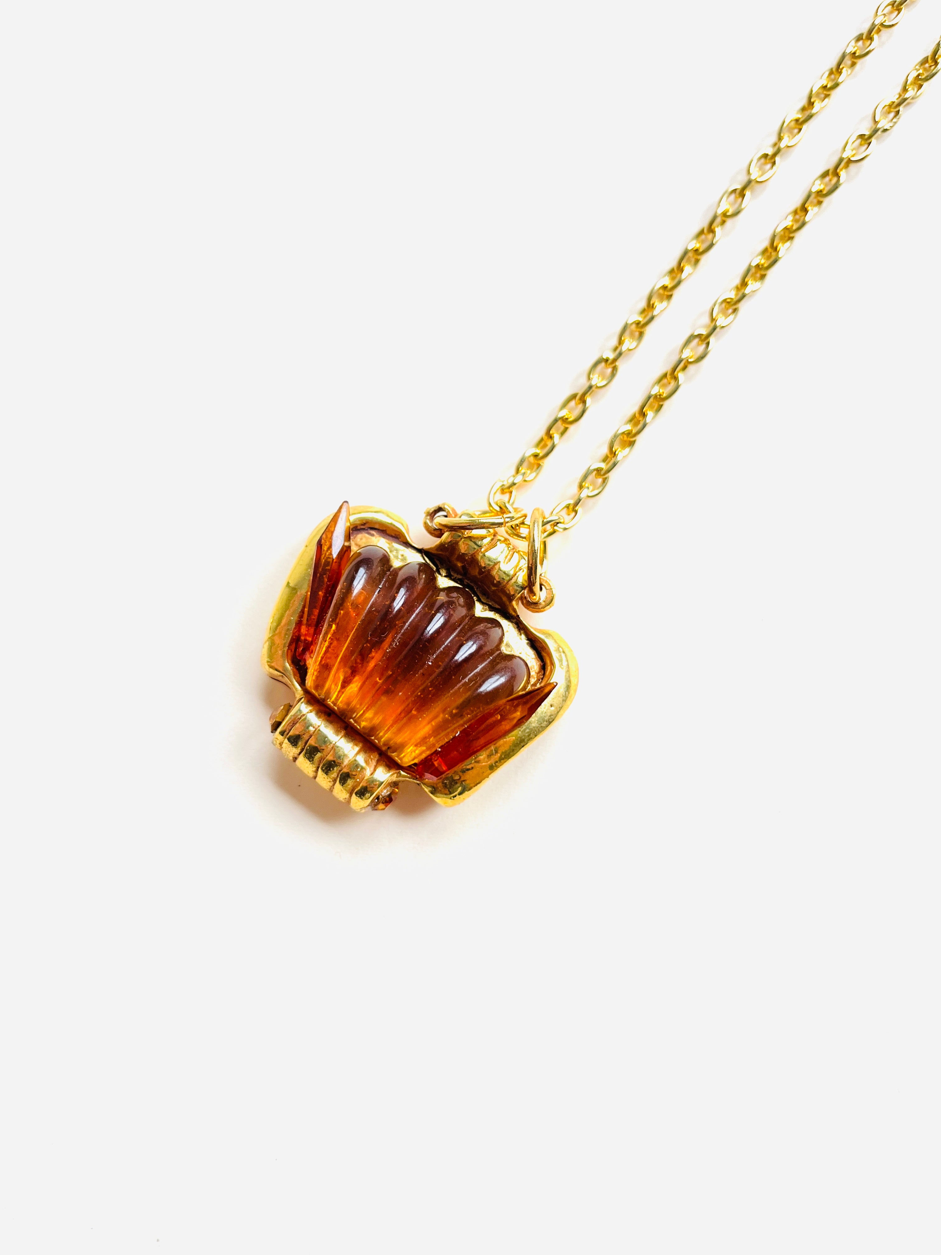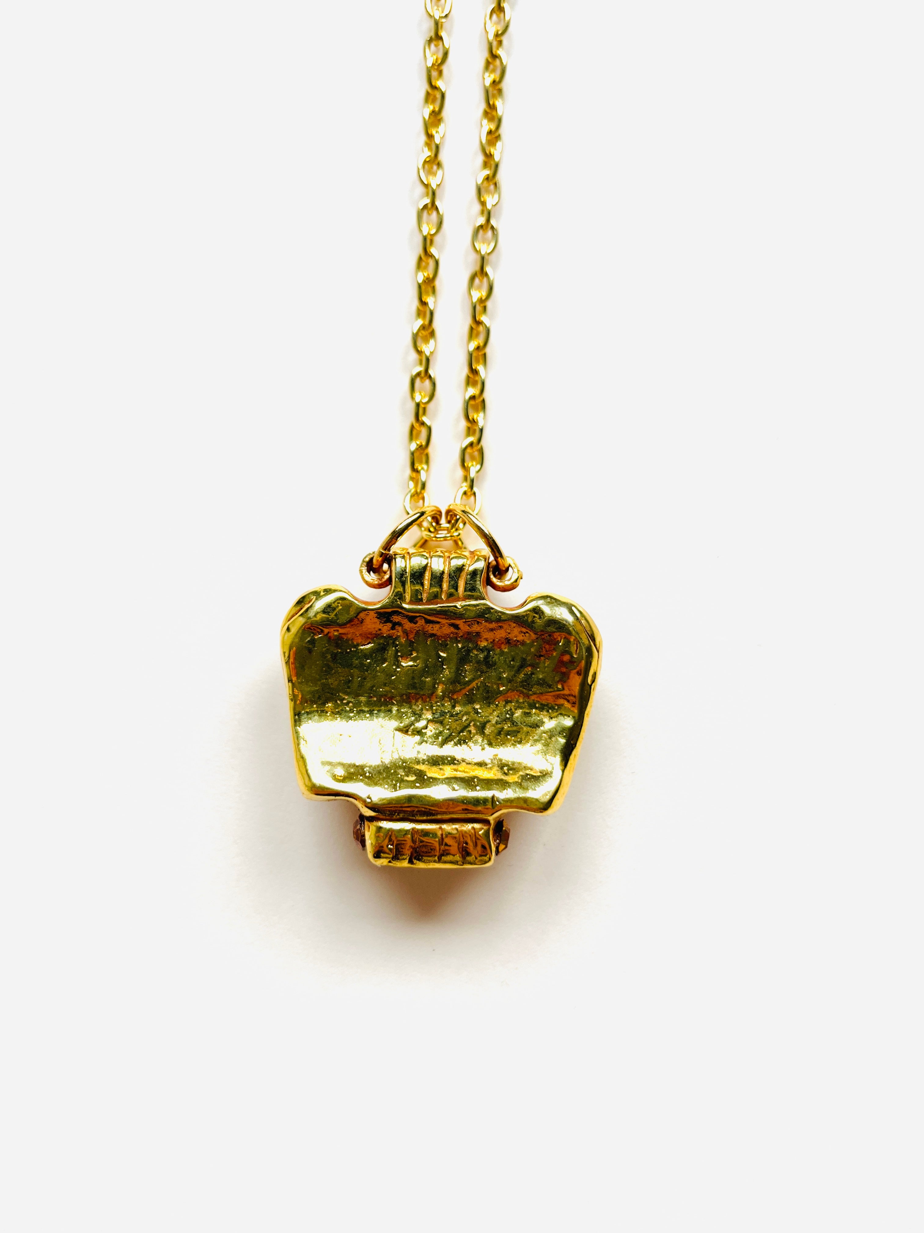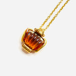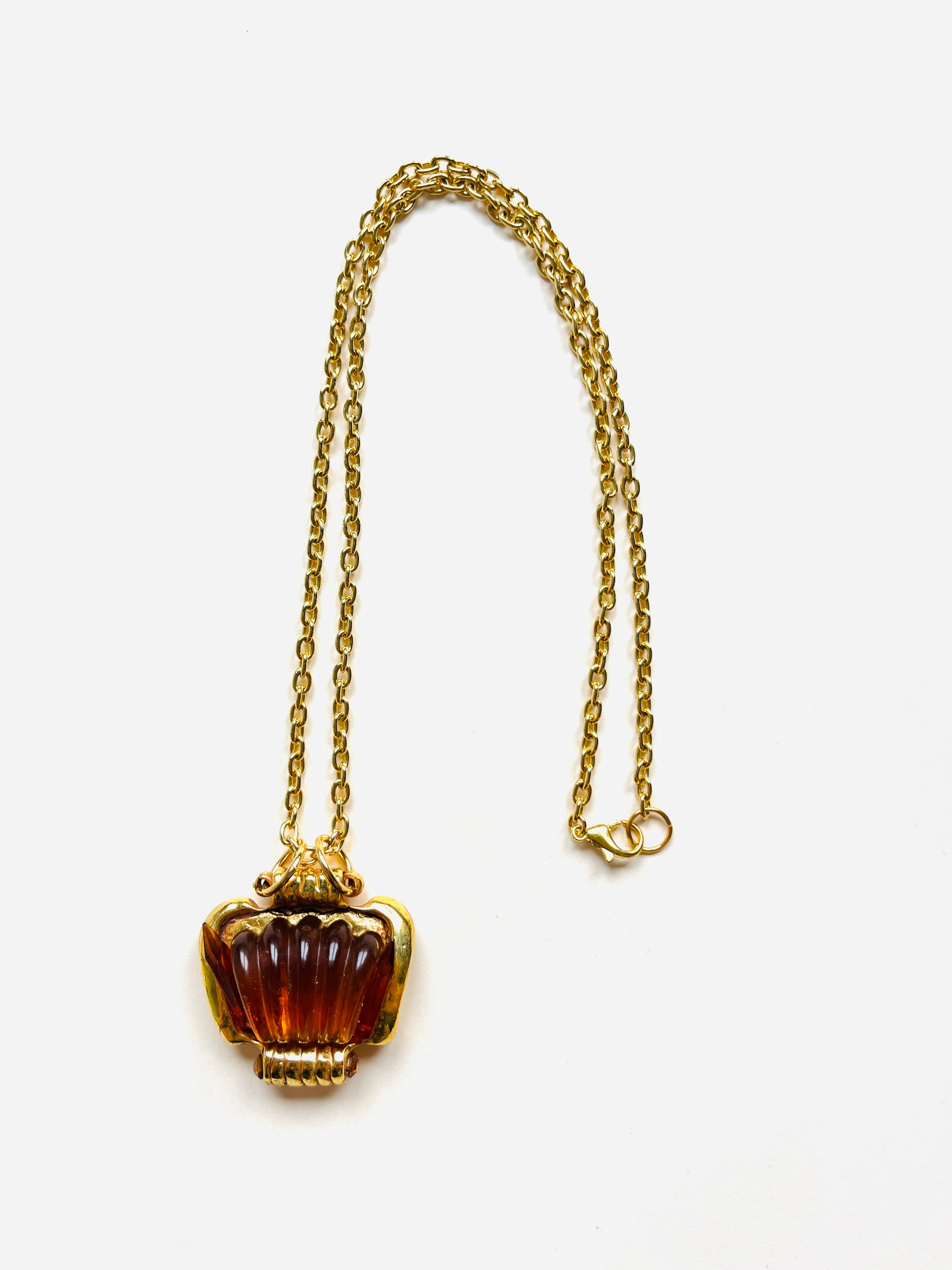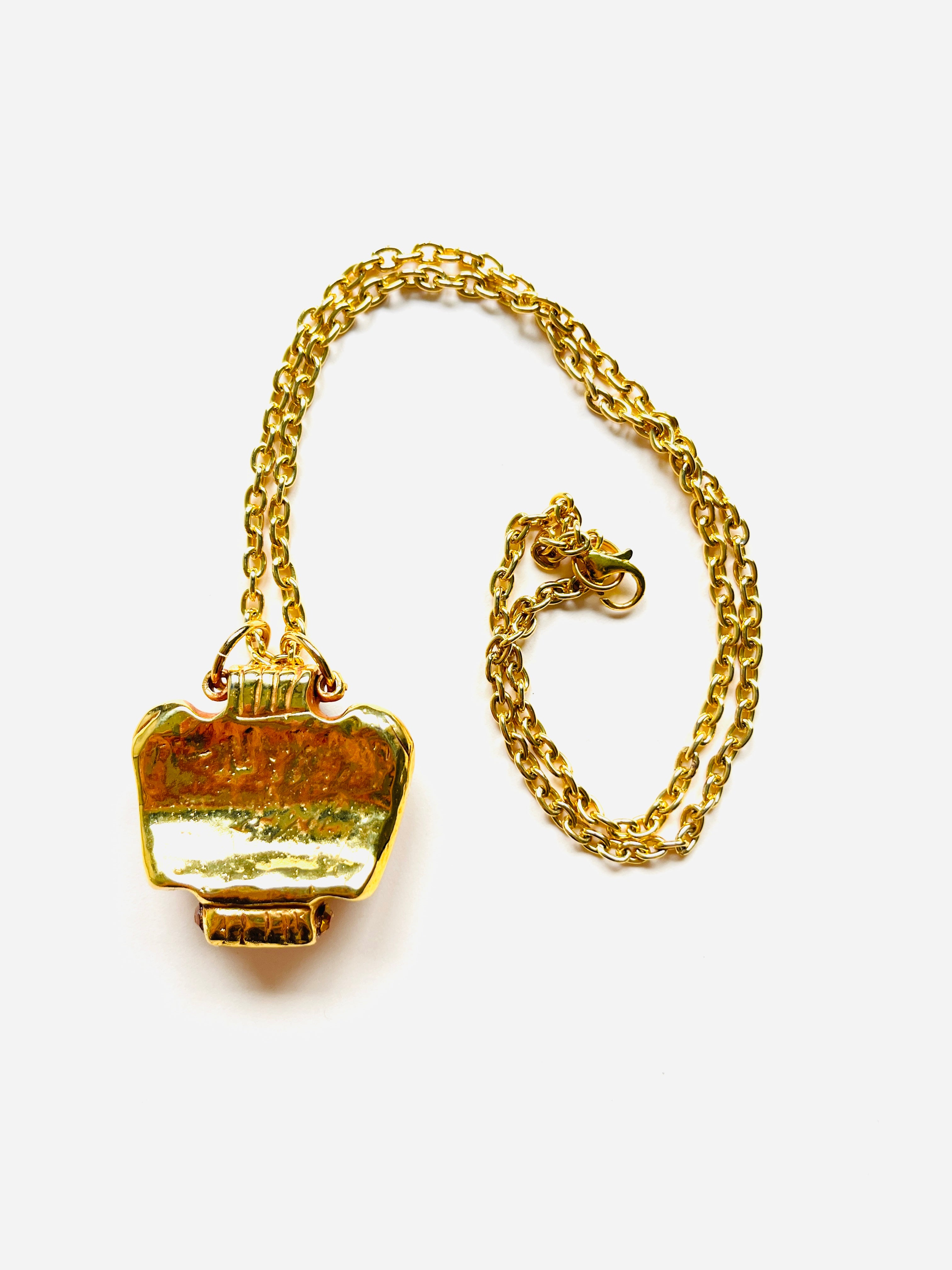 Vintage necklace repaired from original 1990s Kalinger pieces. Square gold-plated base made of the brand's characteristic porous material and brown resin.