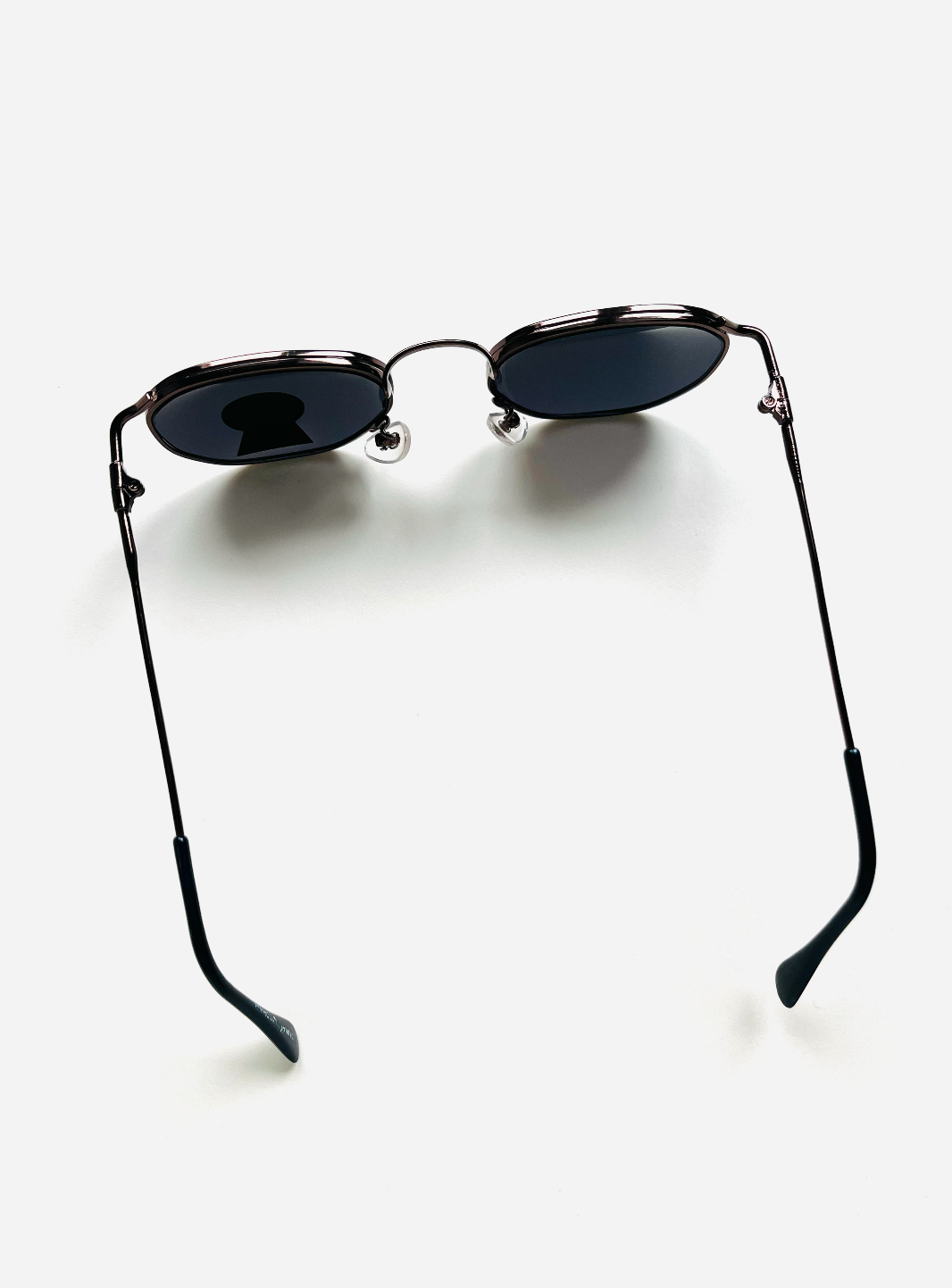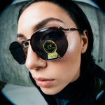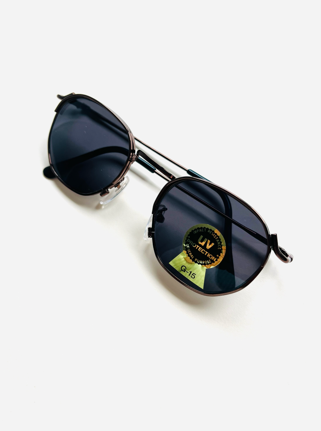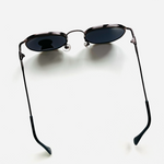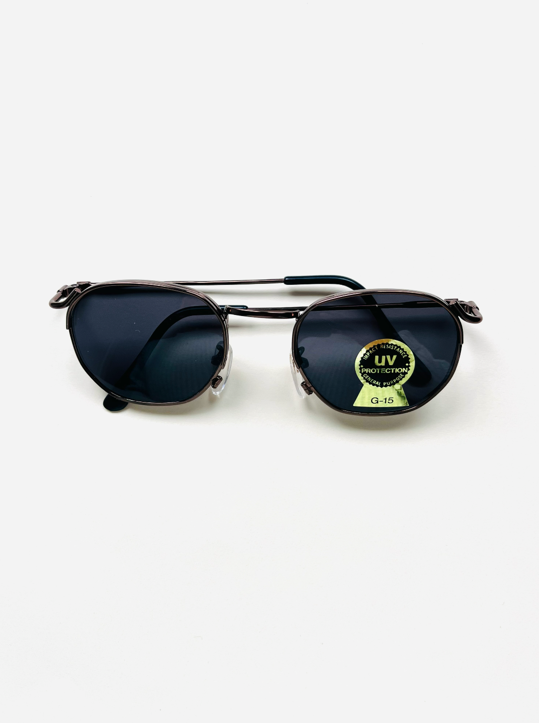 Original vintage unisex sunglasses from the 90s, first-hand. Brown metal frame with thin temples and black tips. Dark lenses with UV protection and impact resistance.
