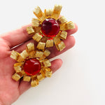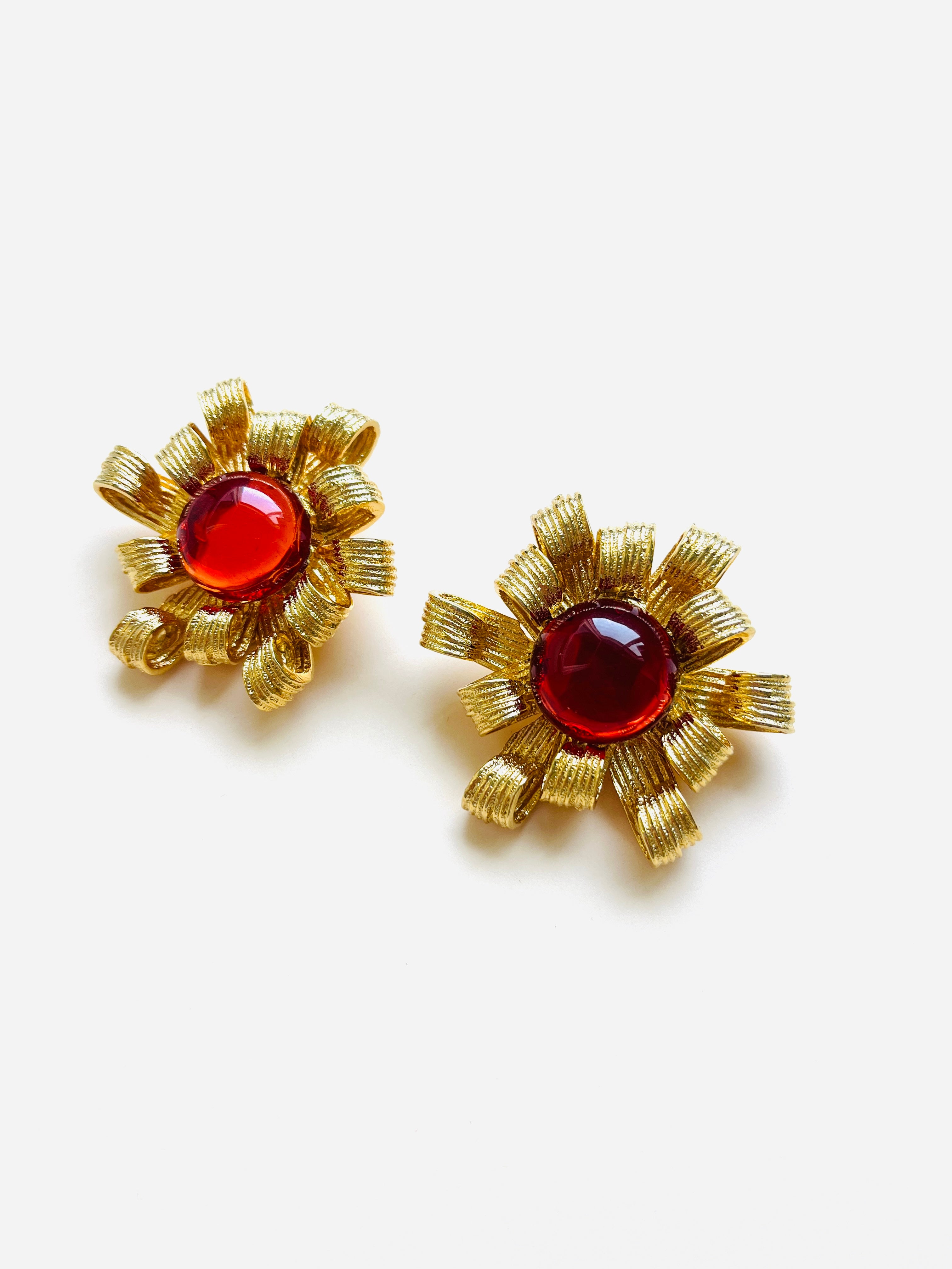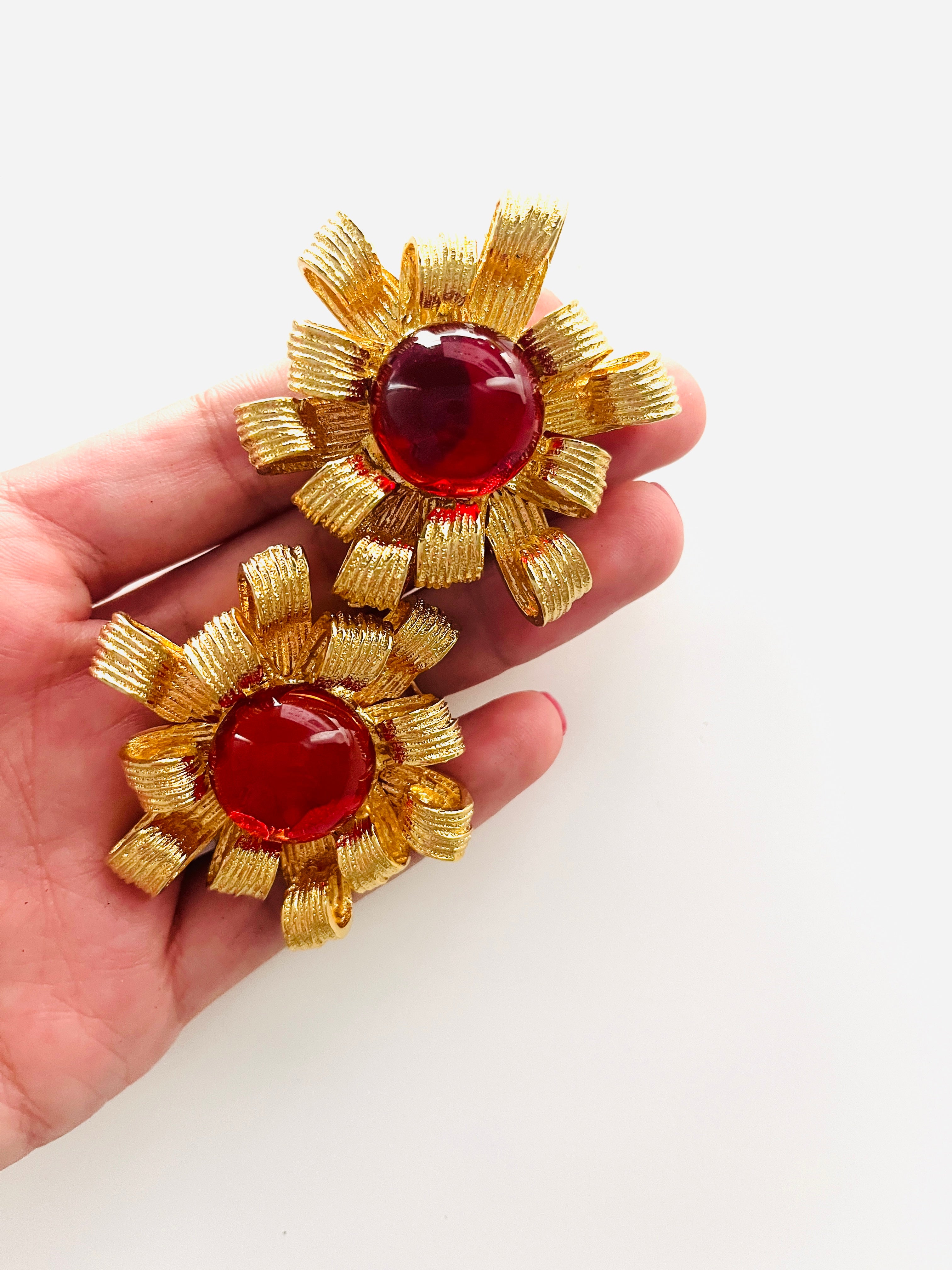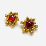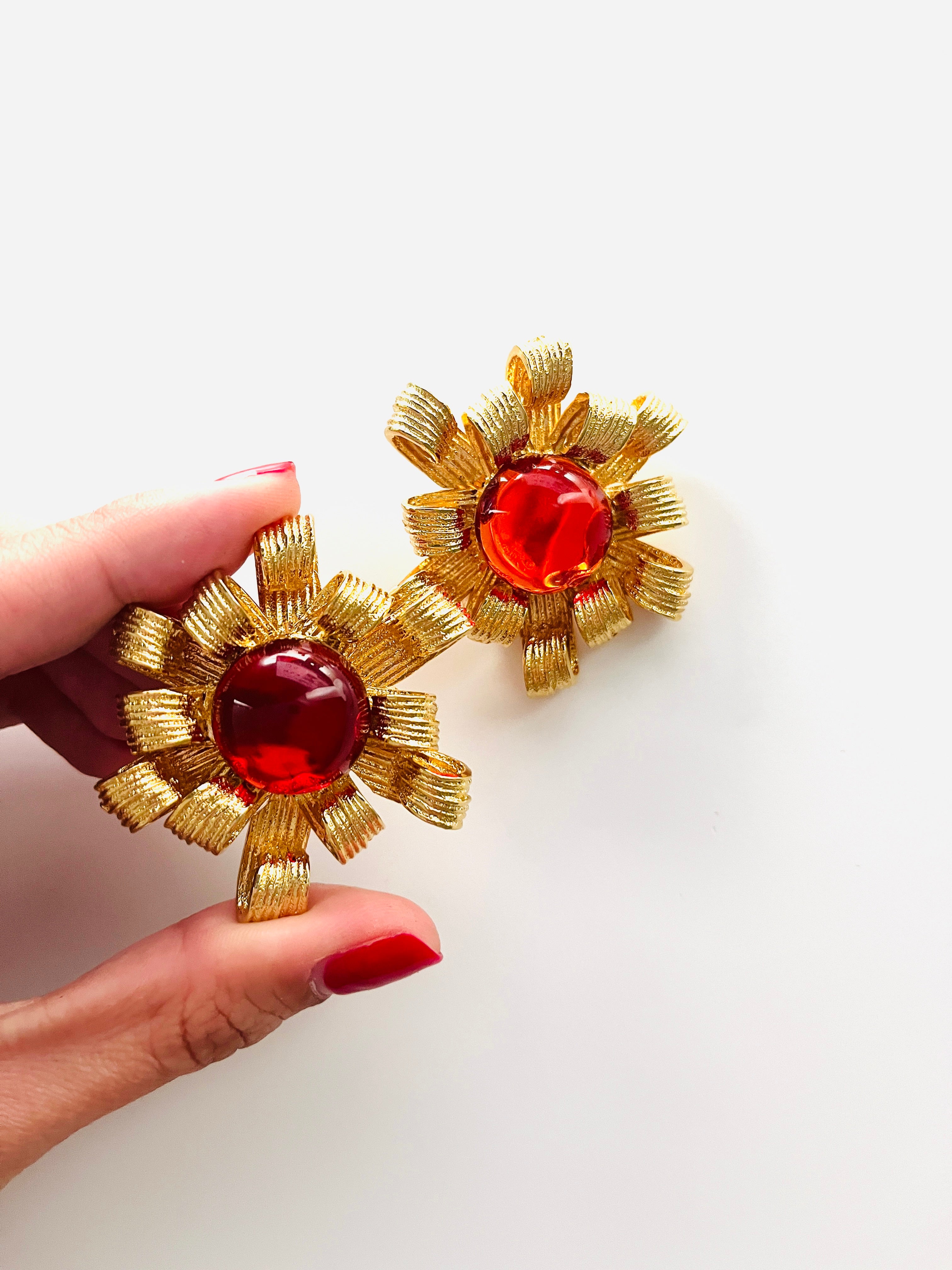 Original 90s maxi gold earrings from the Les Bernard VO brand (Made In USA) with central red crystal and clip closure.