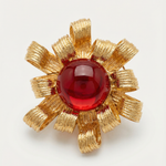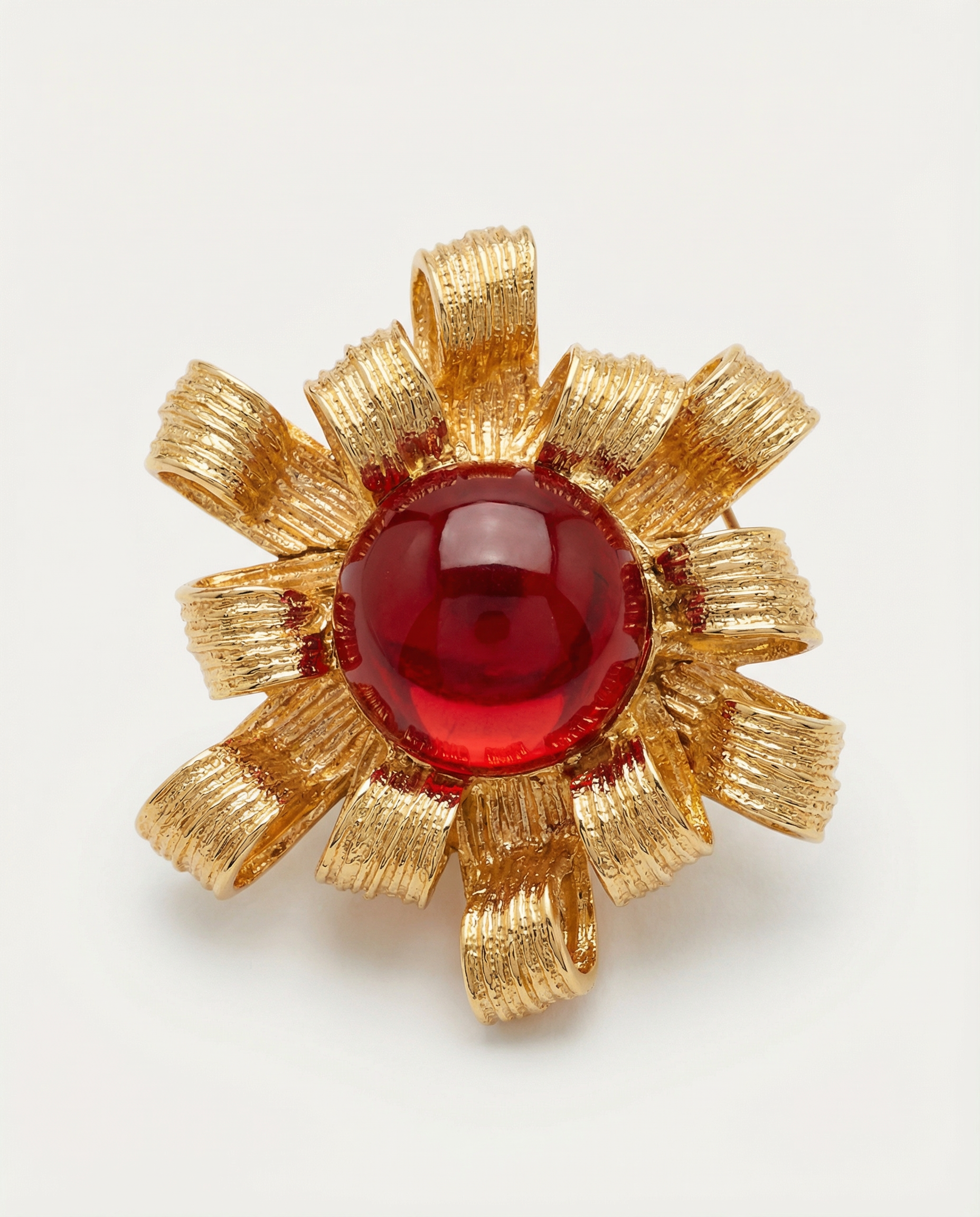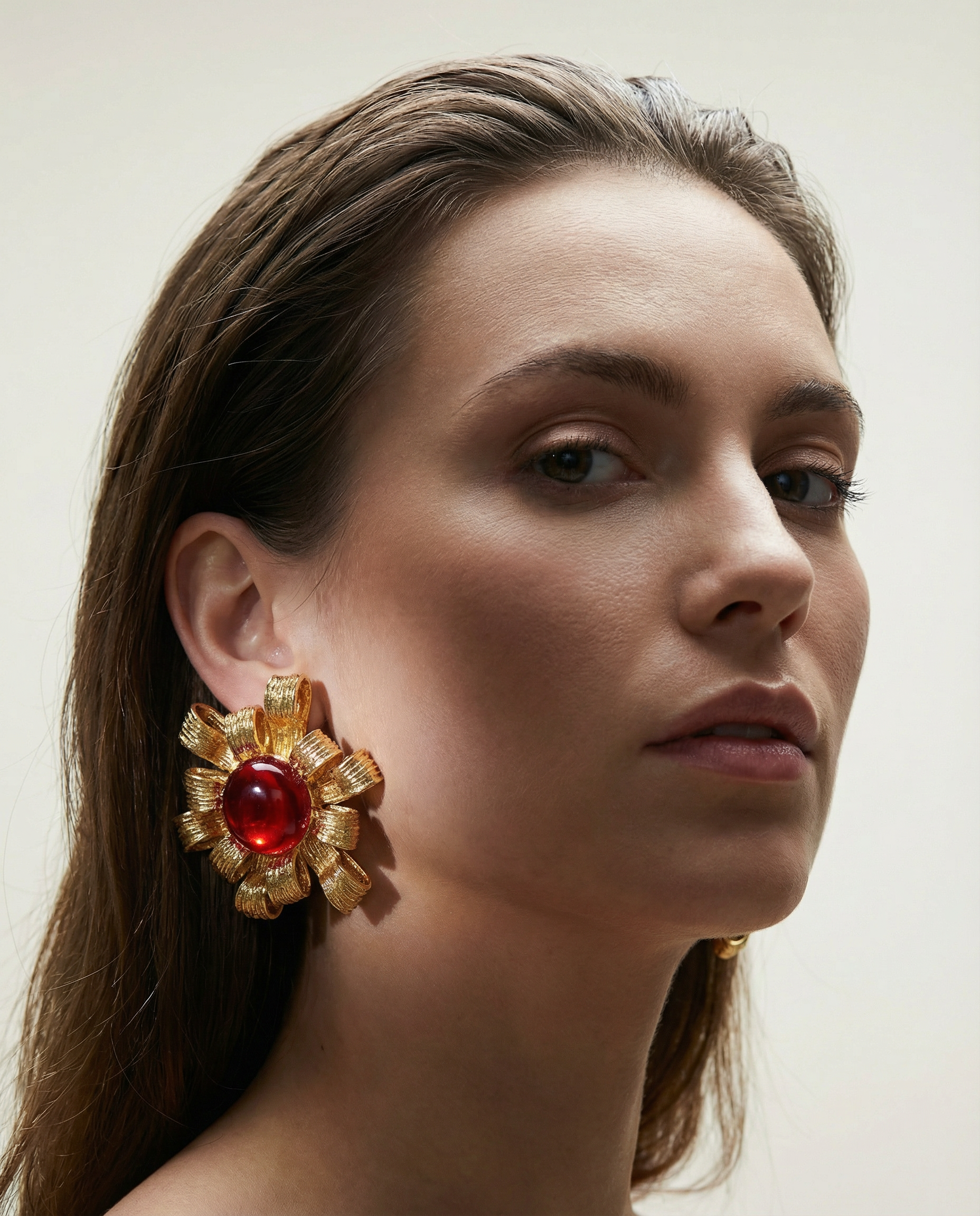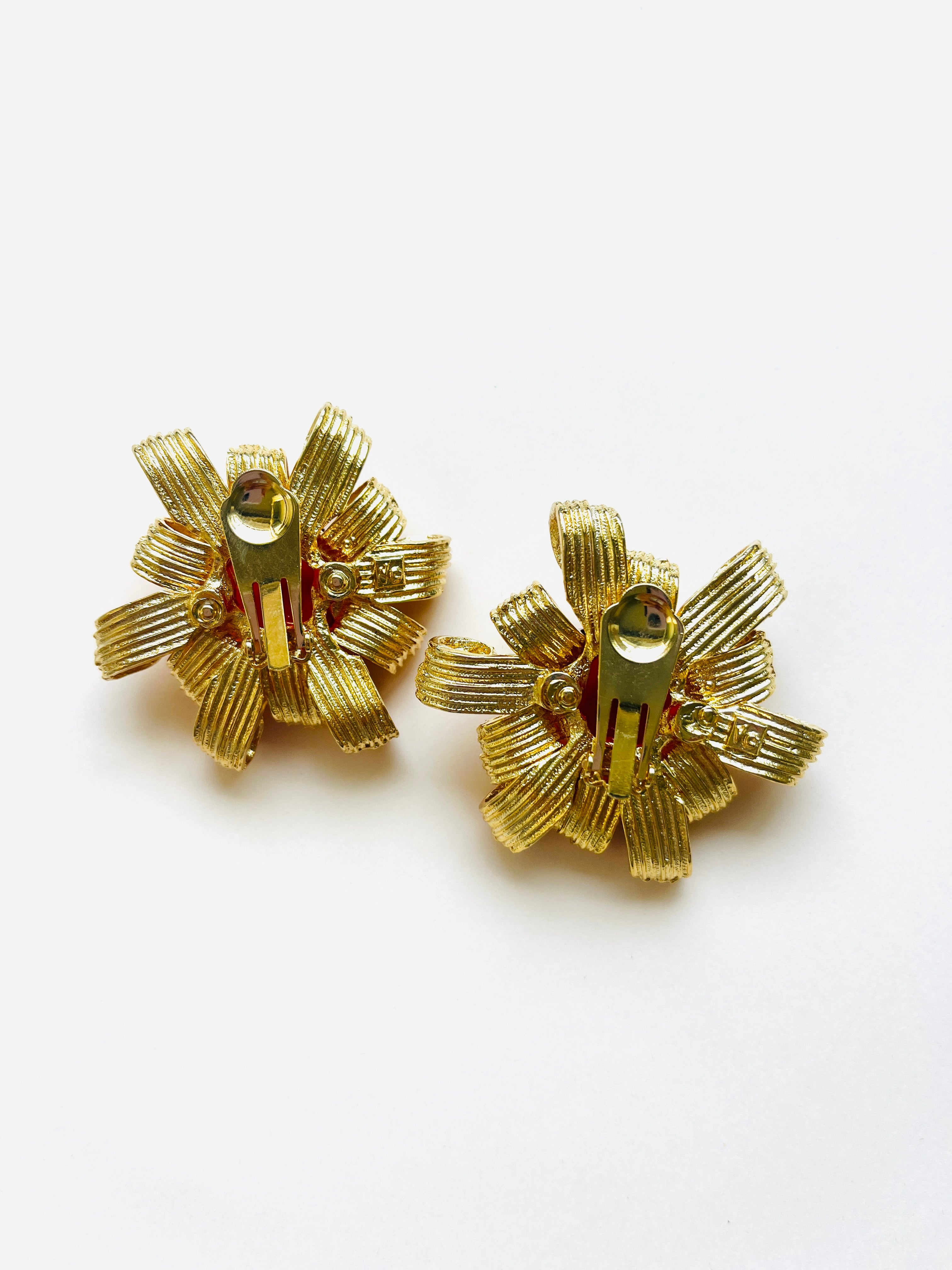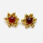 Original 90s maxi gold earrings from the Les Bernard VO brand (Made In USA) with central red crystal and clip closure.