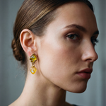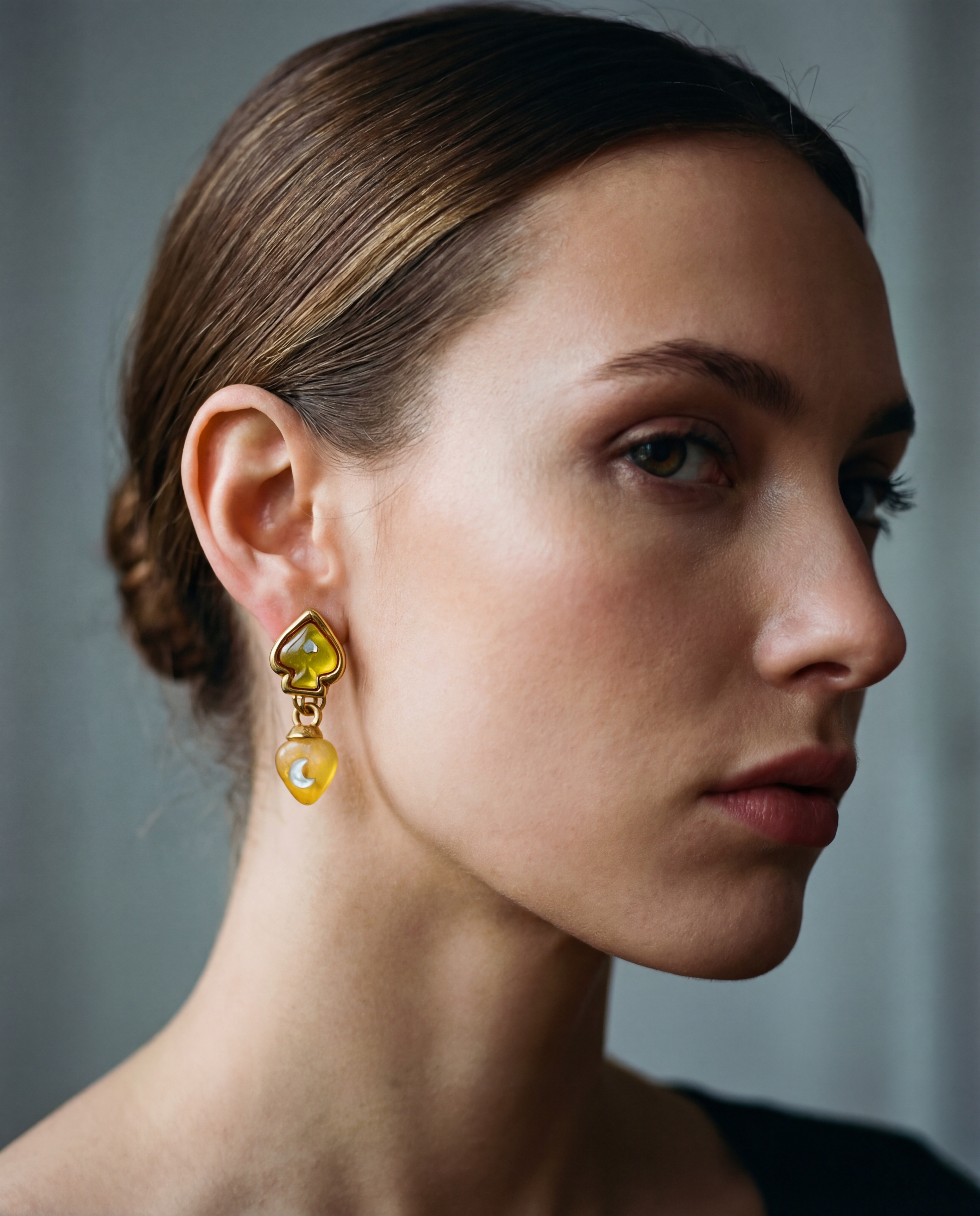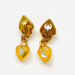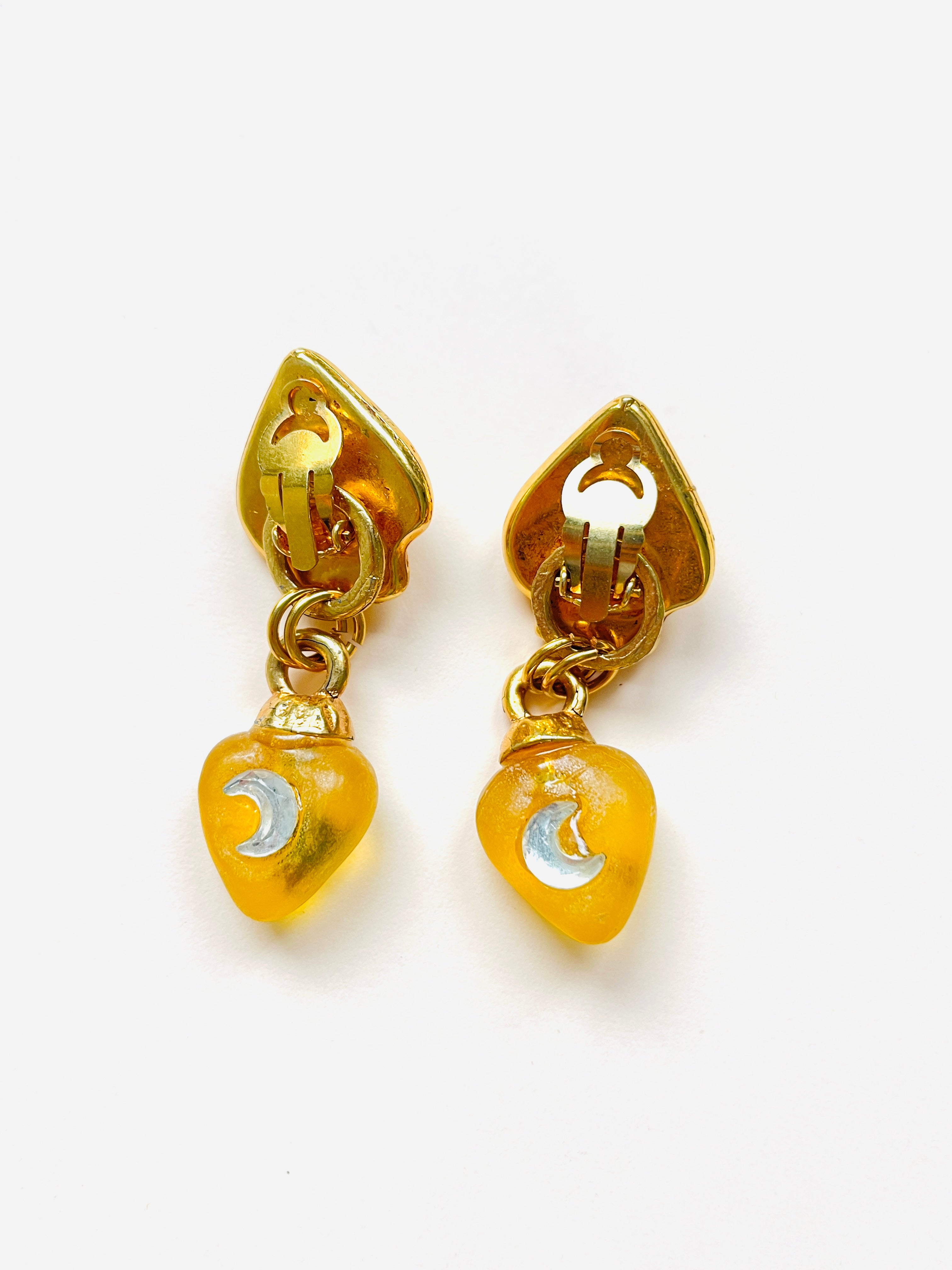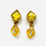 Original vintage earrings from the 90s. Gold-plated base with clip closure and yellow resin with white crystal moon and heart embellishments. Two-in-one earring; the pendant can be detached to use just the base.