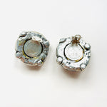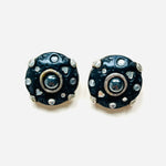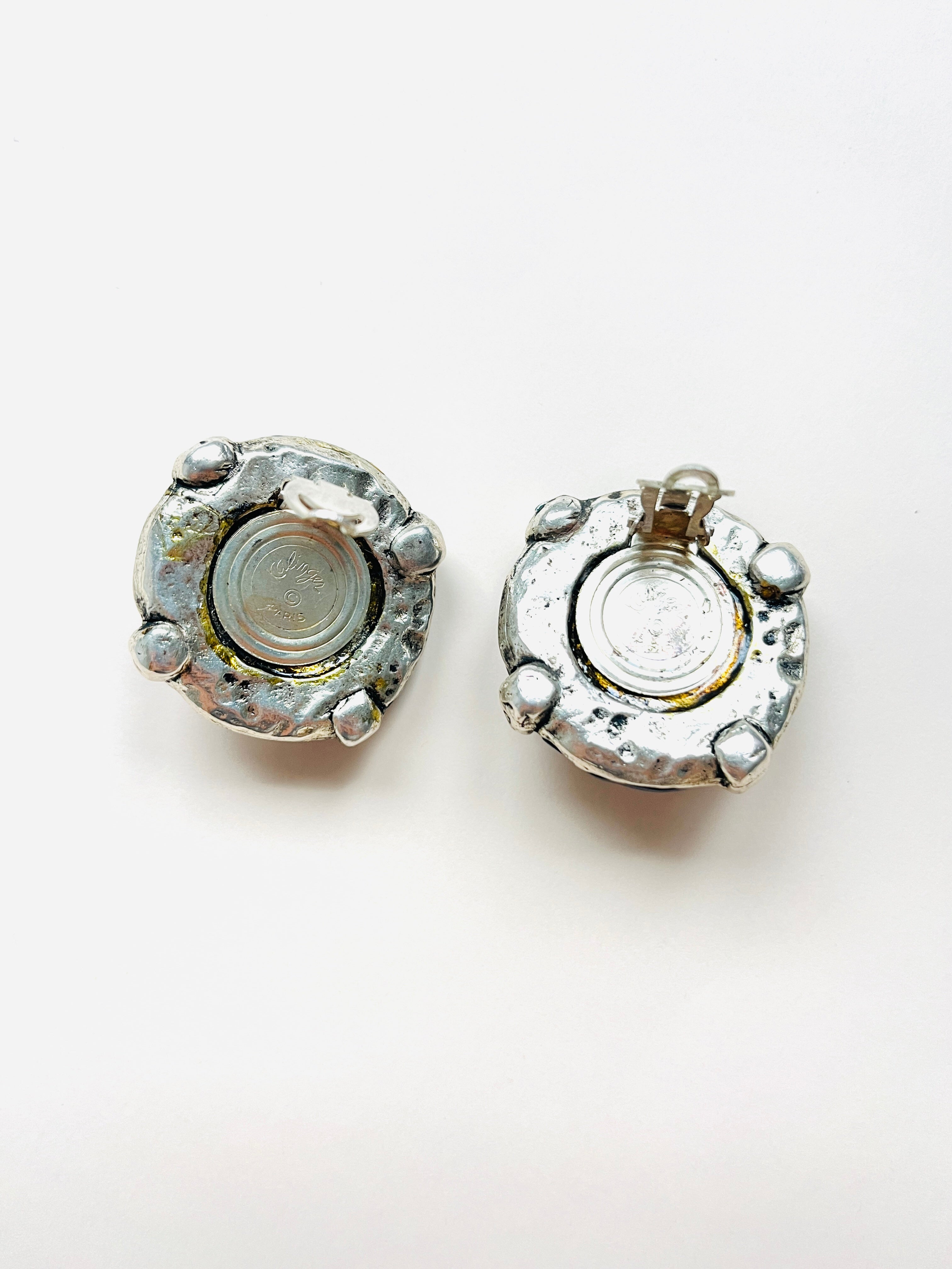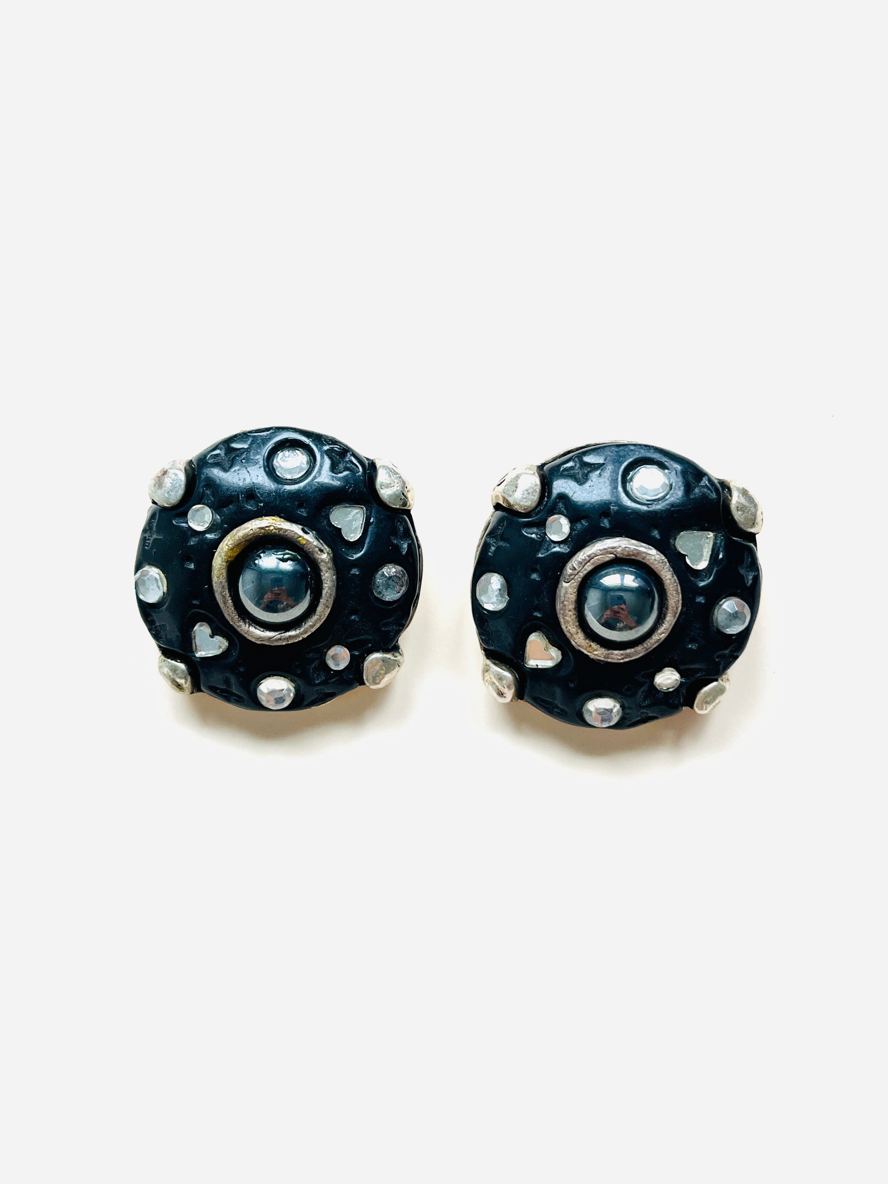 Original 90s clip-on earrings. Round silver base made of the brand's characteristic porous material, with black resin, white crystal appliqués, and a gray central piece.