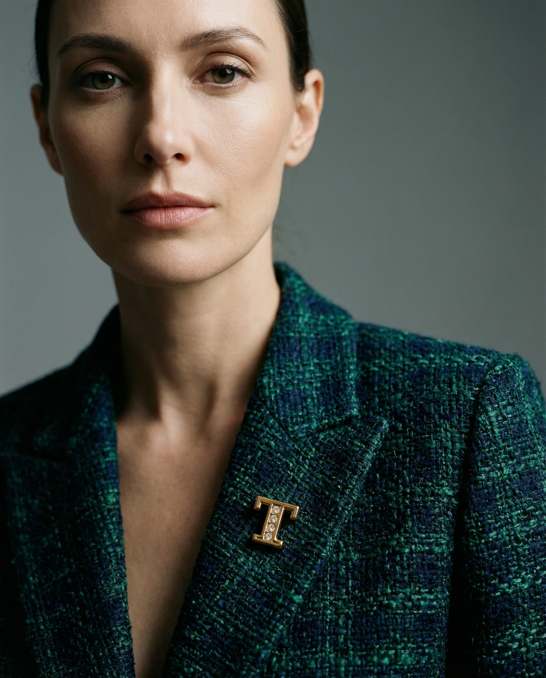 Original vintage brooch from the 90s with pin closure. Gold base in the shape of the initial T with white crystal appliqués.
